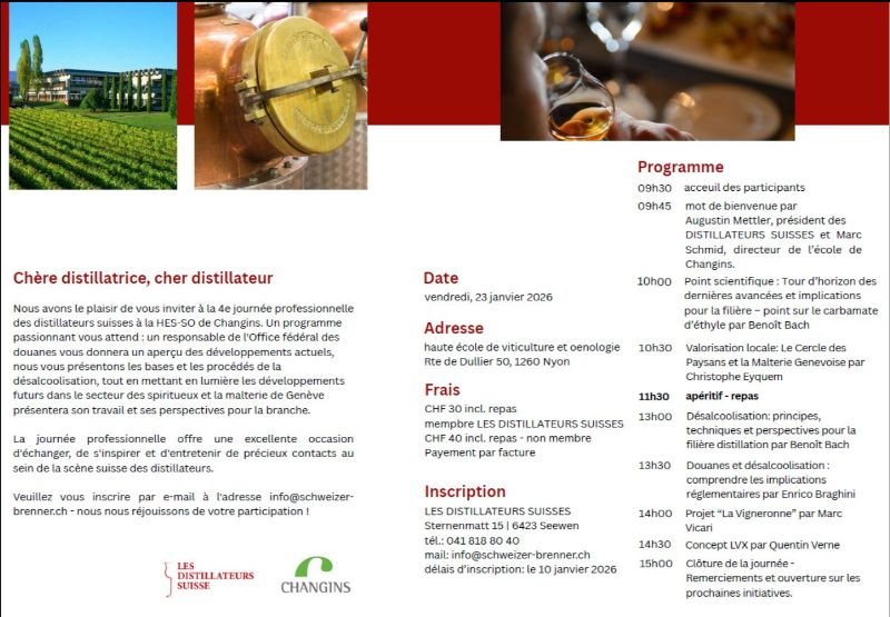 Nous avons le plaisir de vous convier à la 4ème journée romande organisée par Les Distillateurs Suisses. Celle-ci aura lieu à la HES-SO de Changins, vendredi, le 23 janvier 2026